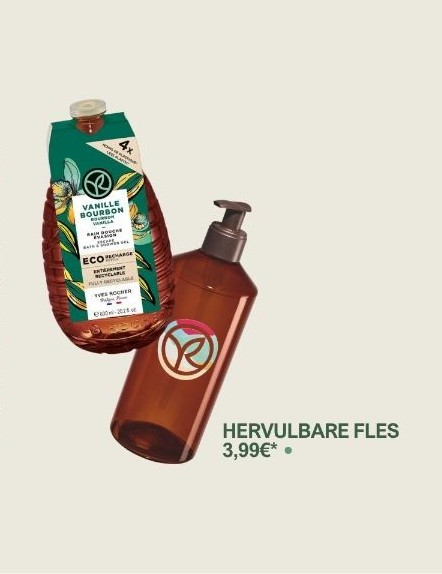 Eco-navulling bad- en douchegel Bourbonvanilllle 600ml: Deze sulfaatvrije douchegel reinigt en parfumeert de huid zonder uit te drogen. De verleidelijke geur van vanille Bourbon omhult je met een zachte en sensuele toets. Er bestaan nog 8 andere onweerstaanbare geuren. Een volledig recycleerbare navulling van 600 ml met 4 keer minder plastic dan onze 400 ml flacon, gemaakt van minstens 90% gerecycleerd plastic afkomstig van strandafval. 6.99€