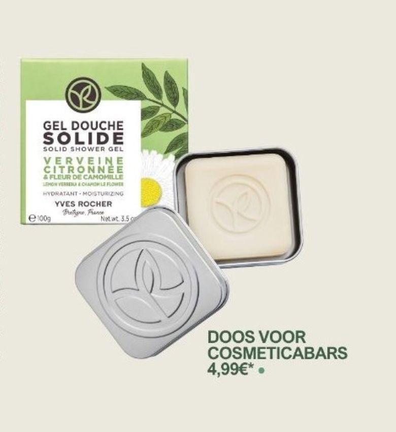 Hydraterende vaste douchegel met citroenverbena en kamillebloemen. De vaste douchegel is samengesteld zonder zeep en sulfaten met een pH-neutrale formule voor de huid zodat deze zacht wordt gereinigd zonder uit te drogen. Verrijkt met zoete amandelen en glycerine, respecteert de natuurlijke hydrtatie van de huid voor meer comfort. Er bestaan nog 7 andere geuren. De zeep is volledig plasticvrij en verpakt in een recycleerbare kartonnen verpakking voor een duurzame douche-ervaring.€6.99.
