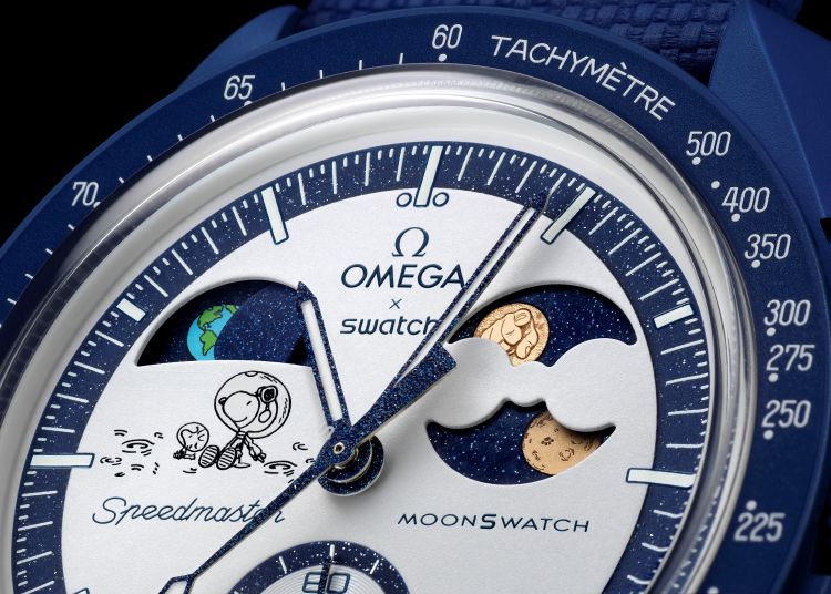 Visueel weerspiegelt dit nieuwe uurwerk zijn voorgangers met dezelfde schitterende wijzerplaat lay-out compleet met de nieuwste aardfase-innovatie van Swatch, een maanfase-indicator versierd met OMEGA’s Moonshine™ Gold en illustraties uit de wereld van Snoopy.