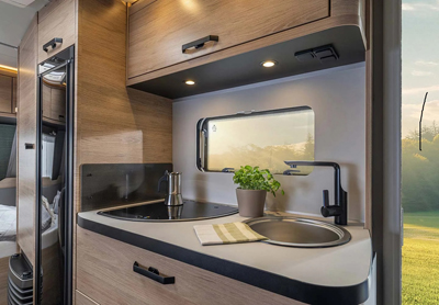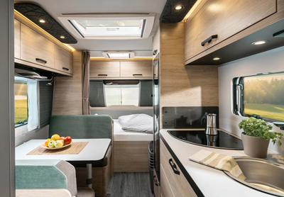 Overdag dient het grote U-vormige zitgedeelte met ramen aan alle zijden als het centrale ontmoetingspunt voor het hele gezin. Direct naast de keuken biedt de lichte en luchtige zithoek voldoende ruimte om samen te eten of de hele middag spelletjes te spelen. Het goed ontworpen interieur beschikt ook over voldoende opbergruimte: wandunits met soft-close-mechanismen, een verlichte kast, compartimenten onder de zithoek en ruime garages zorgen ervoor dat al uw reisuitrusting veilig opgeborgen kan worden