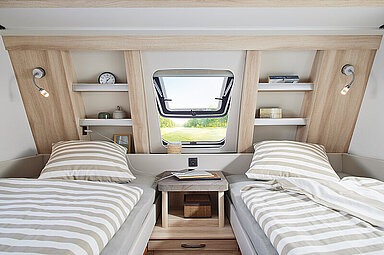 Met een technisch maximaal toegestane gewicht van slechts 1.700 kg en een lengte van slechts 7,54 meter, kan de Hobby DE LUXE 515 UHL dankzij het goed ontworpen interieur tot zes personen vervoeren. Aan de voorkant van de caravan staan twee eenpersoonsbedden, elk 1,93 meter lang en 82 cm breed. Een optionele beduitbreiding transformeert de eenpersoonsbedden tot een extra grote slaapruimte.