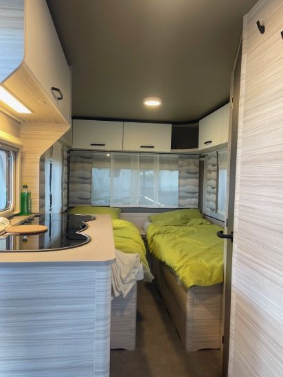 Onder de eenpersoonsbedden zijn er grote opbergruimtes, die je eenvoudig kunt bereiken door de lattenbodem omhoog te klappen. Aan de rechterkant is een serviceluik aangebracht, zodat je ook van buiten eenvoudig kunt in- en uitladen