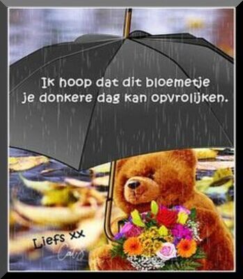 En met die glimlach denken we voor ff niet aan  de zon die  ons in de steek laat en dat miezerige gedruppel daar buiten en dat is dan al een pluspunt voor deze dag ! Dat we Weekend zijn is dan  nog eentje die we zomaar krijgen en we zijn en blijven optimist over wat er nog kan volgen !Dus ... wat ook het weer is of word laat je weekend daardoor niet verpesten en geniet er van!