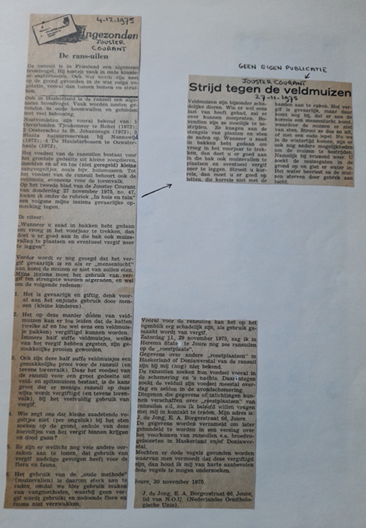 Toen ik de afgelopen week wat aan het nazoeken was in het grote papieren archief kwam in een oud plakboek tegen met artikelen die ik geschreven had en bewaard. Daarin stond een van mijn eerste artikelen in de Jouster Courant van 4 december 1975. Het was een artikel over het voorkomen van ransuilen naar aanleiding van een eerdere publicatie van de redactie Strijd tegen de veldmuizen in de Jouster Courant van 27 november 1975 waar het gebruik van gif korrels was aangeraden in de gemeente Haskerland. Nadien verschenen er regelmatig publicaties in de Jouster Courant. Dat schrijven in de Jouster ging nog door tot diep in de jaren 90 weet ik me te herinneren. Leuk om zoiets nog eens terug te kunnen zien in de tijd van nu.