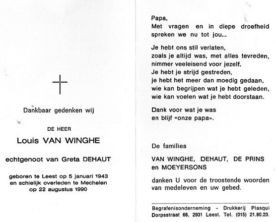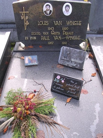 Foto’s : -Louis Van Winghe, jaren na zijn legerdienst. -Zijn doodsprentje. -Zijn laatste rustplaats die hij deelt met zijn zoon Paul die een jaar na zijn vader zelfmoord pleegde.