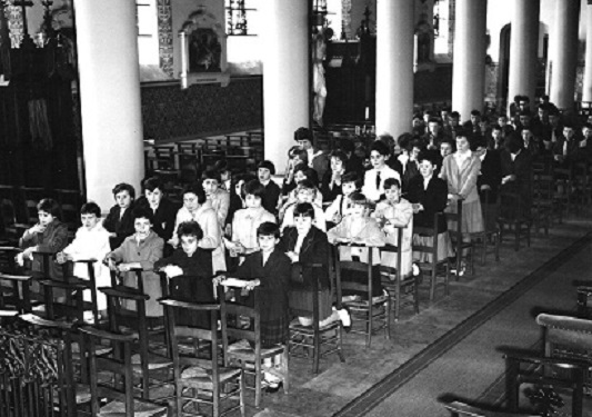 In het daaropvolgende nummer van “De Band” : Chiro & Landelijke Jeugd. “Wanneer we beide titels thans bij mekaar voegen, dan krijgen we dadelijk de betekenis op rekenkundige wijze herleid tot Louis en Hilde. Zaterdag 5 mei l.l. waren de jeugdorganisaties in feest, want ook zij jubelden om het geluk dat twee jeugdfiguren tegemoet gingen. Beiden zouden in den echt treden en begunstigd worden door een weertje (op voorhand verzorgd door de jeugdige PIEN) verbeidende het grote ogenblik ingezet door de burgerlijke echtverbintenis gevolgd door de kerkelijke inzegening. Tot buiten toe weerklonken de jubelliederen door de meisjes van de Landelijke Jeugd en B.J.B.-meisjes gezongen, en bij de intrede van het jonge paar, ontvangen door Z.E.H. Pastoor en besprenkelt met wijwater met als gebed : “God besprenkele U met de dauw van zijn genade” (psalm 127) weerklonk : “Wel Zalig, die den Heer in vrede dient, en wandelt op Zijn weegen. “Moogt ge eten van het werk van Uw handen, “Welzalig gij : het ga U wel !” Antifoon / Uit Sion zegene U de Heer, alle dagen van Uw leven ! Alleluia ! De huwelijksmis werd insgelijks bijgewoond door de B.J.B.-meisjes, Landelijke Jeugd en Chirojongens met vaandels en gezangen door de meisjes. Als assistenten aan het altaar de huidige proost E.H. Verbiest en zijn voorganger E.P. Clementiaan; ook het zonnetje was van de partij, zij had haar stralen alléén voorbehouden voor het jonge paar, er was immers niets te bespeuren in de andere beuken. Het was eenvoudig en aangrijpend. We zagen menig traantje wegpinken door omstaanders, toen twee stralende wezens de kerk langzaam verlieten als man en vrouw. Door de B.J.B.-leidster Mariette De Prins werd een gelegenheidstoespraak gehouden waaruit, het kon niet voldoende gezegd worden, de dank, de genegenheid, naar voren kwam ; ook door een Chirojongen, een burchtknaap, werd een mooie plant aangeboden en de B.J.B.-meisjes kwamen voor de pinnen met een zeer schoon O.L.Vrouwbeeldje. En dan terwijl de orgeltonen de blijdschap onderstreepten vertrokken onder grote belangstelling en sympathie twee gelukkige mensen. Een jongen en een meisje die het beste van hun krachten gegeven hebben, jaren lang, om de jeugd op te voeden, er wat van te maken en of ze iets bereikten ! Twee voorbeelden voor de jeugd ; voor hen zou het geen schoner geschenk kunnen zijn mocht hun werk door de nieuwe uitverkorenen voortgezet worden. Jeugd zoekt elkaar, werkt voor elkander, is een steun voor mekaar. Hier is de jeugd samen gebleven, en zal samen blijven zolang het God moge believen. Louis en Hilde, dank voor wat u beiden hebt gedaan voor Uw broeders en zusters, vaart veilig over de golven der bruisende zee, en wij wensen U beiden een “GOEDE VAART EN BEHOUDEN THUISKOMST”.”