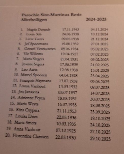- Zaterdag1november RetieSint-Pieterskapel 10.00u.Woord-en Communiedienst RetieSint-Martinus 14.00 u. Gebedsdienstmet uitrei kingvandekruisjesvandeoverle denen 18.00u.Eucharistieviering opgeluisterddoorhetkerkkoor VoordefamileVanloyenkinderen, KarelVanloy-CatharinaMermans VoorLouisSlegers-AnnaGijs VoorJuliaSmetsenfamilie