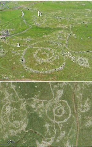 Aerial views of Circles 11(a) and 12 (b) identified in a survey conducted by remote sensing and published in the PLOS ONE journal on March 18, 2026. (Aerial imagery provided by the survey of Israel (MAPI)- used with permission. Upper photo by A. Wiegman. Prepared by M. Birkenfeld and U. Berger)