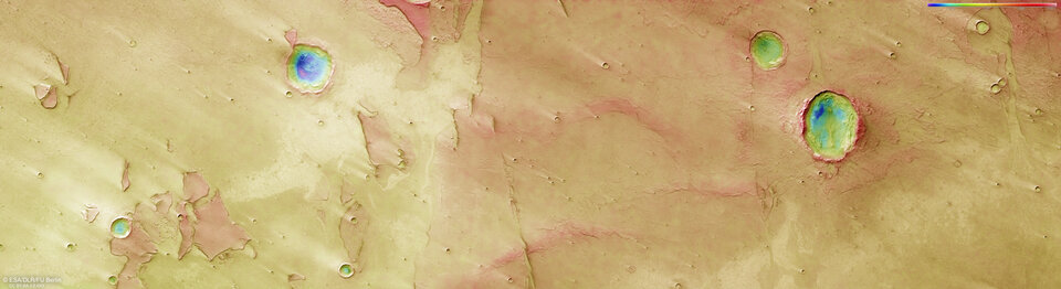 The mesas stand out sharply against the brownish surroundings thanks to layers of exposed dark material at their edges. As on Earth, it is probably rich in magnesium and iron and was formed by eruptions. In the past, this region experienced fairly powerful volcanic activity, resulting in the accumulation of lava and ash deposits over time, which were buried by other materials.