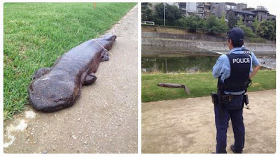 On the 4th of July a normally nocturnal dog-sized Giant Salamander decided to take a walk alongside the Kamogawa River in down-town Kyoto, Japan. People were apparently so shocked by the sight of the rare creature that the police were summoned to the scene.