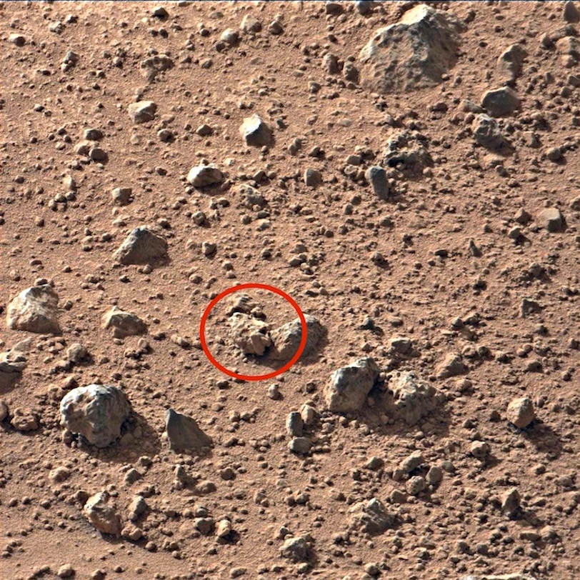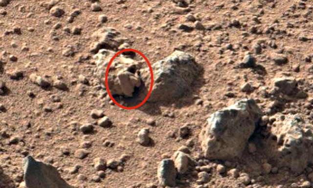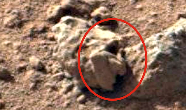 I was looking over the NASA site Midnightplanets which is a site run by NASA that keeps photos on back up. I found an alien skull in one of the Curiosity rover photos in sol 410. The soul has lots of detail...you can even see two large teeth in its wide open mouth. Its jaw and cheeks and eye ridges are well pronounced. The nose looks human-like, but wider and thicker on the top. The back of the head seems to have a part of the neck and head still attached to it. Awesome fossil find and is absolute proof that aliens once lived on Mars. But the fact that it died laying on the surface and its mouth wide open makes me think it died in terror or pain.