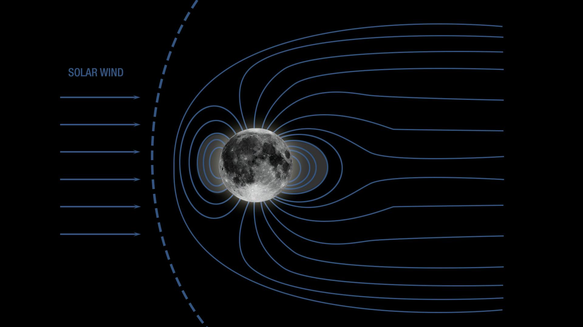 An illustration of the Moon's magnetic field, which acts as a shield from charged particles in outer space.