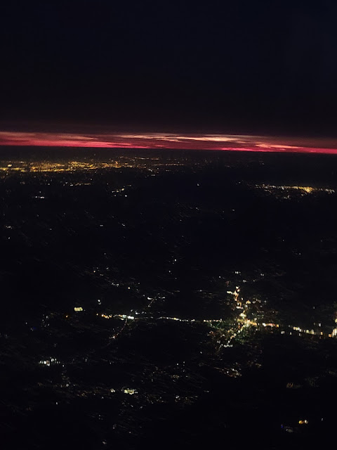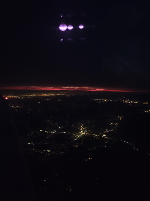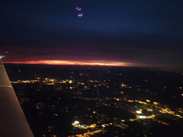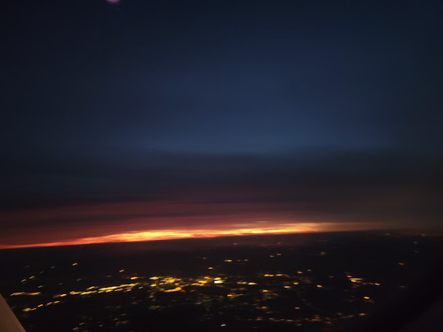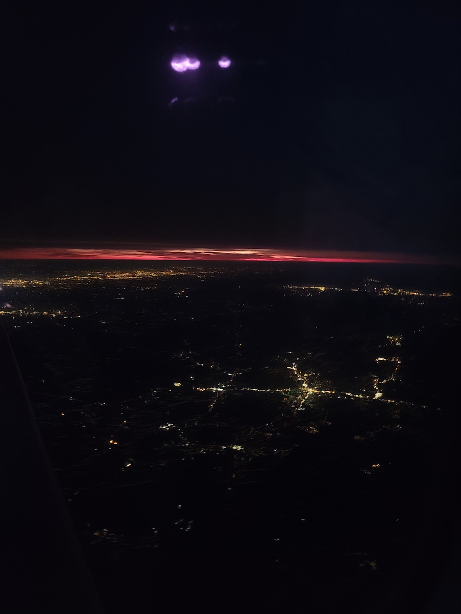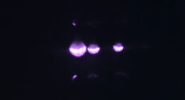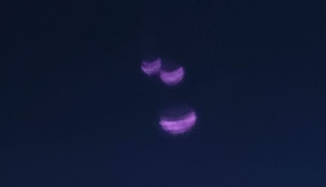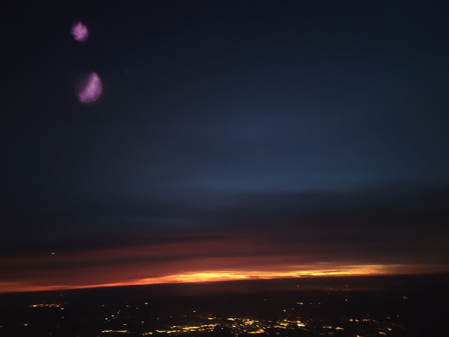 Eyewitness recorded several purple orbs flying past the plane window by accident. The UFOs are all separate, but flying in a pattern as if they work together as one. I don't think this is a lens flare or light reflection off the window. Though my years of reporting UFOs, the one most common time UFOs are seen is during sunset, probably because more people looking at the sky at that time to see the sunset itself. But I also think the suns rays at a low point can actually shine up from below the UFO illumination it, even if its cloaked, so some UFOs are visible for a few seconds to a few minutes during sunset. That is what happened here.
