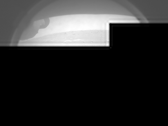 Première image en couleur du site d'atterrissage de Perseverance acquise par le rover de la Nasa quelques instants après son atterrissage. Pour les scientifiques, ce paysage présente de nombreuses caractéristiques intéressantes dont des blocs rocheux enterrés et des cailloux d’une très grande variété de taille. À l’horizon, on distingue ce qui est certainement le rempart du cratère.