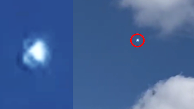 Now here is a strange UFO flipping around in the sky as if it were turning around to look in different directions. The UFO has a main diamond metallic shape with a curved area sticking out of each of its four sides. Its darting around trying to find a place to hide in the clouds, but the blue sky makes it too obvious and the eyewitness noticed it as it was moving from one cloud to anther. I just have never seen this shape of UFO before...that right there makes me believe...this is a real alien craft.