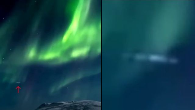 The object becomes more visible due to the northern lights which reflect off the object, making it clear that it is not a commercial aircraft but a UFO.