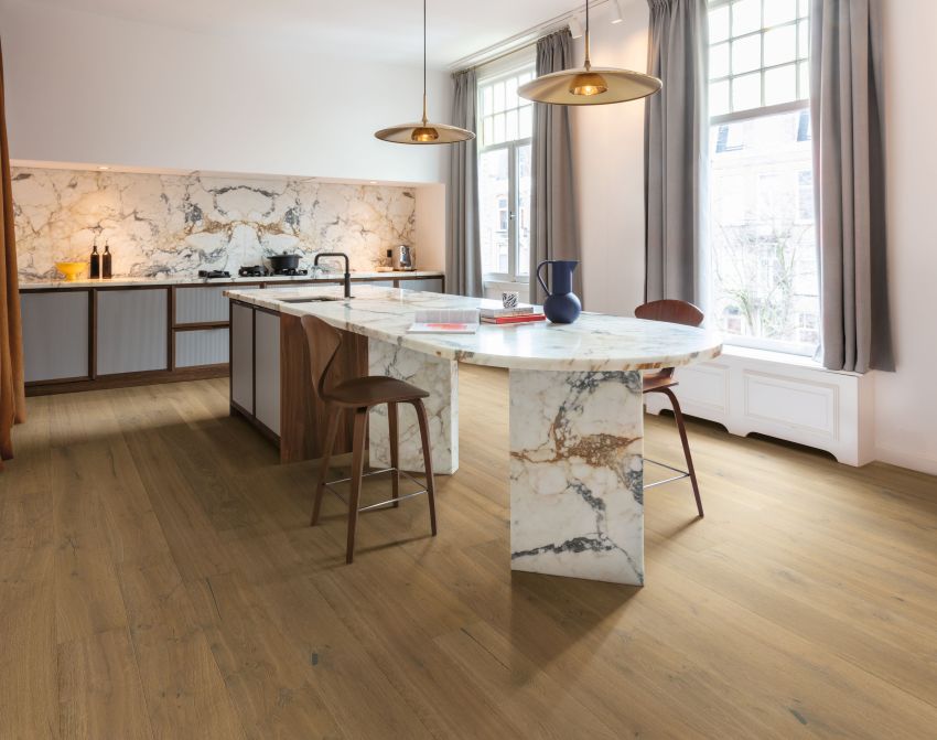 “Donkere vloeren geven een interieur meteen een gevoel van luxe. Ze creëren een warme basis waar rijke materialen helemaal tot hun recht komen,” zegt Anastasiia Kudashova, Design Manager bij Quick-Step.