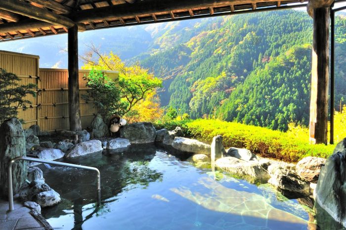 In de diepe Iya-vallei op Shikoku ligt het Iya Onsen Hotel, waar je in natuurlijke warmwaterbronnen kunt baden te midden van een berglandschap. Wat dit verblijf extra bijzonder maakt, is de kabelbaan die je van het hoofdgebouw naar de openluchtbaden brengt. Tijdens de korte rit daal je af langs de bergwand en kijk je uit over de vallei en de rivier beneden. De buitenbaden liggen direct in de natuur, terwijl in het hoofdgebouw een ruim binnenbad te vinden is met een panoramisch uitzicht over de Iya-vallei.