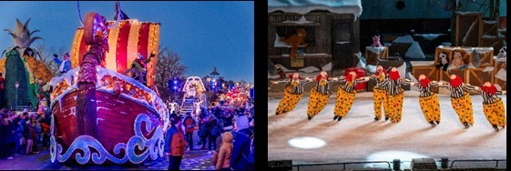 Ook op het vlak van shows belooft dit winterseizoen een ware belevenis te worden. Het ijsspektakel Qui veut la peau du Père Noël ? brengt de speelgoedfabriek tot leven in een betoverende mix van humor en spanning. De show Quel cirque ! combineert acrobatiek, muziek en komedie voor een kleurrijk en energiek moment vol verwondering. De musical C’est du Délire ! neemt je mee in de avonturen van Groupidupianix en Serotonine: hij droomt ervan de beroemdste bard van heel Gallië te worden, terwijl zij er alles aan doet om de eerste vrouwelijke druïde te worden. Daarnaast zorgen nog tal van andere animaties voor een dag vol vermaak en onderdompeling in de warme kerstsfeer van het park. En om de dag in schoonheid af te sluiten: de Défilé de Noël Gaulois brengt de bekende parkfiguren en hun verlichte praalwagens samen voor een groots feestelijk moment, gevolgd door L’Île aux vœux (wenseneiland), een nachtelijke slotshow vol muziek, licht en vuurwerk.