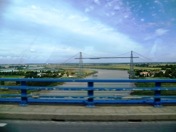 En onze tocht gaat verder.Geen problemen met starten en de batterij blijft op peil. Van op de hoge brug van Rochefort kunnen we een blik werpen op de Pont Transbordeur.Deze hebben we reeds op een vroegere reis gaan bekijken. De «Pont transbordeur du Martrou», (hangende pont) is gebouwd in 1900. Het is een meesterwerk van metaal. Het is ook het laatste overblijfsel van dit type kunstwerk in Frankrijk. Ingehuldigd op 29 juli 1900 na 27 maanden van de bouw.Zij bestaat uit twee metalen torens van 66,25 meter hoog, een schort van 175,50 meter lang, oplopend tot 50 meter boven het water en een mand opgehangen aan het dek. De brug is geclassificeerd als een historisch monument. Vandaag de dag is de brug als toeristische attractie voor voetgangers en fietsen. De overtocht is niet gratis ( 2,20 retour per volwassene) en duurt 4 minuten en een half.
