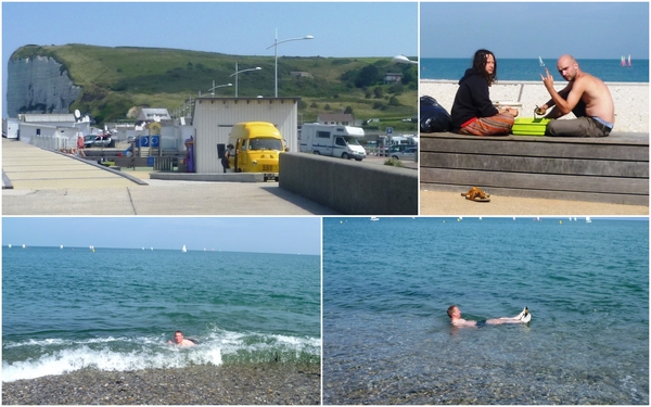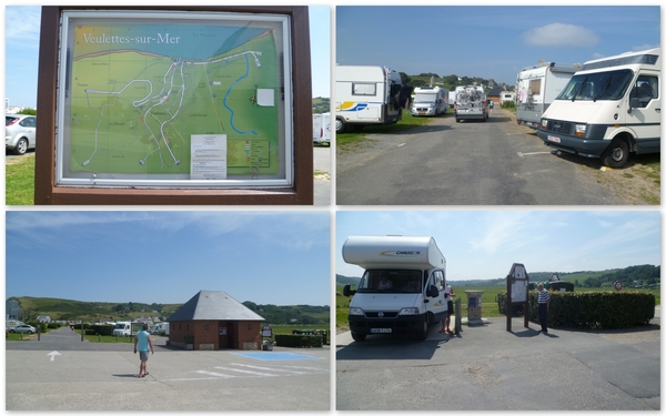 We blijven nog even te betalende autoroute volgen zodat we niet in het havengebied terechtkomen. Onze voorlaatste halte wordt Veulettes sur Mer. De laatste kilometers zijn via kleine smalle wegen. Veulettes sur Mer is een klein kustplaatsje gelegen tussen Fécamp en Saint Vallérie en Caux. We gaan eerst naar de service gelegen in de Chemin des Courses om onze overbodige ballast te lozen en voor de laatste keer water bij te tanken. (Water : jeton 3,00 te verkrijgen in het Office de tourisme of in de plaatselijke krantenwinkel). Wat we niet wisten is dat er nu ook een service en WC's zijn op de MH-parking op de dijk (parking 4,50/24u) We installeren ons en na het avondeten blijven we nog een lange tijd buiten zitten. Er waait wel een fris windje maar tussen de twee MH zitten we goed ingesloten. We hebben een rustige nacht en zijn al vroeg op stap naar de bakker. De zee zie je niet van op de parking door de vele vakantiehuisjes langs het strand maar de gezellige wandeldijk en het aangename zonnetje nodigen ons uit. Het eerste dat we tegenkomen is ons middageten. We kunnen er niet langs kijken, een geel karretje met in grote letters "Frites" en geen diepvries maar verse geschilde aardappelen. We geven onze bestelling al door zodat hij genoeg patatten kan schillen. Langsheen de keien op het strand duwen we de buggy met de tweeling tot aan de rand van het water. Onze schoonzoon gaat even uittesten of het water op temperatuur is en na een duik in het zeewater komt hij er niet meer uit. Zalig volgens hem. Je zit tien dagen ergens langs de kust en dit is de eerste keer dat de temperatuur het toelaat om in zee te gaan. We zetten onze wandeling langsheen de wandeldijk verder en als we terug op de parking komen wordt alles in gereedheid gebracht voor ons middageten. De frietjes worden gehaald, het stoofvlees dat we bij hebben opgewarmd en alles wordt met smaak opgegeten. Wij belgen kunnen toch genieten van een goed pak friet, zelfs op vakantie.We zijn klaar om naar onze laatste stopplaats te rijden, onze vakantie loopt op z'n einde.