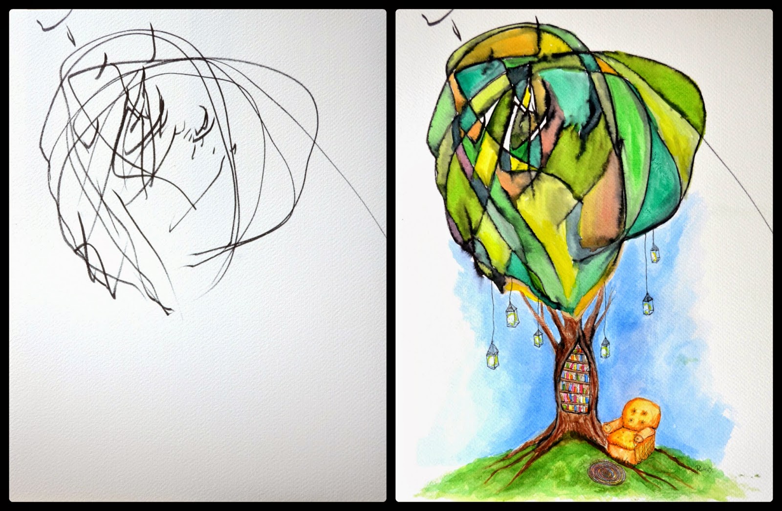 Bovenstaand werk heet de Droom van de Boekenwurm. Op het einde wordt duidelijk waarom. In de droom worden geen bomen meer omgehakt om boeken te drukken want de boeken groeien rechtstreeks uit de boom. klank zacht houden https://www.youtube.com/watch?v=N253Hph2xNA 01min08