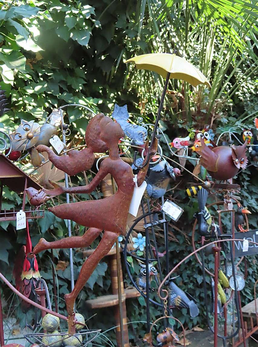 Voor de etalage van een winkeltje met snuisterijen merkte ik dit metalen meisje met paraplu op. Ik vond dit wel iets hebben en dus nam ik vlug een foto vooraleer de uitbater buiten kwam om mij zijn waren aan te prijzen
