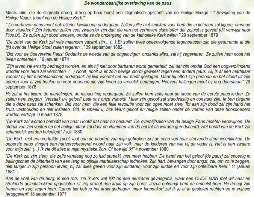 Onze Lieve Vrouw: Mijn kinderen, mijn grote boodschap van herstel kan niet gehoord of begrepen worden buiten het perspectief van de toekomst van de Heilige Kerk en de wereld. Het is de laatste, de laatste, de laatste poging van mijn Zoon Jezus om de mensheid terug te leiden naar de Verlossing.