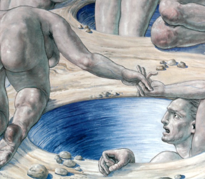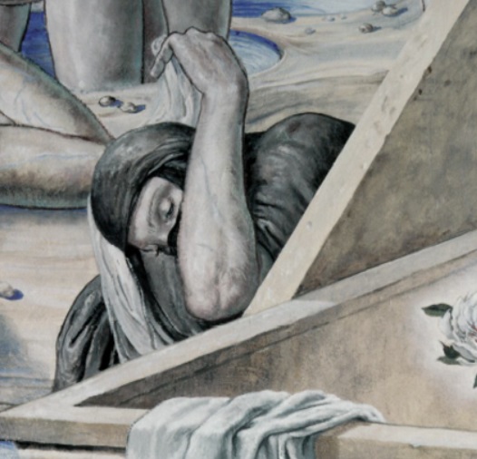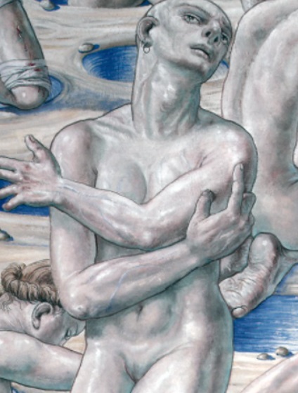 In dit detail komt een van de doden tevoorschijn uit het gat dat zich in de aarde opent, in de hoop naar de hemel op te stijgen.