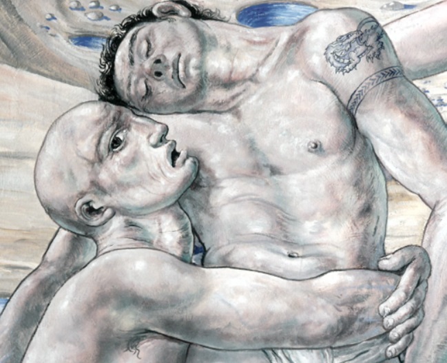 Rechts verschijnen eerst twee mannen, die elkaar omhelzen in een erotische pose; rechts van hen verschijnt een transseksueel.