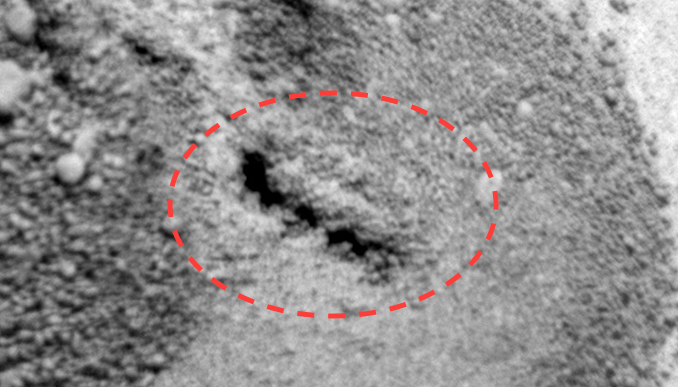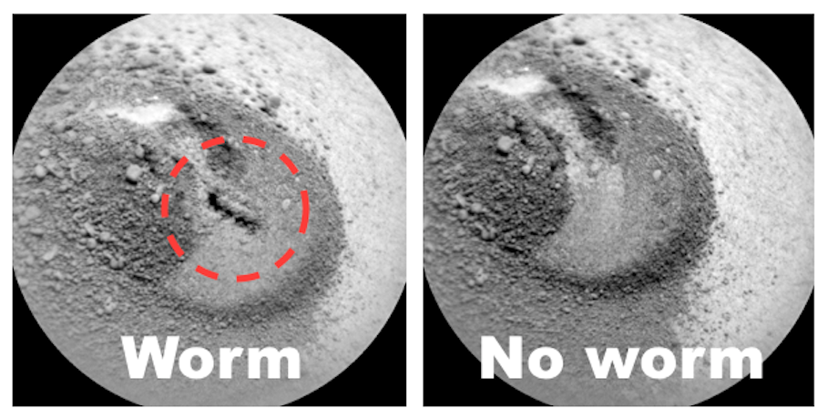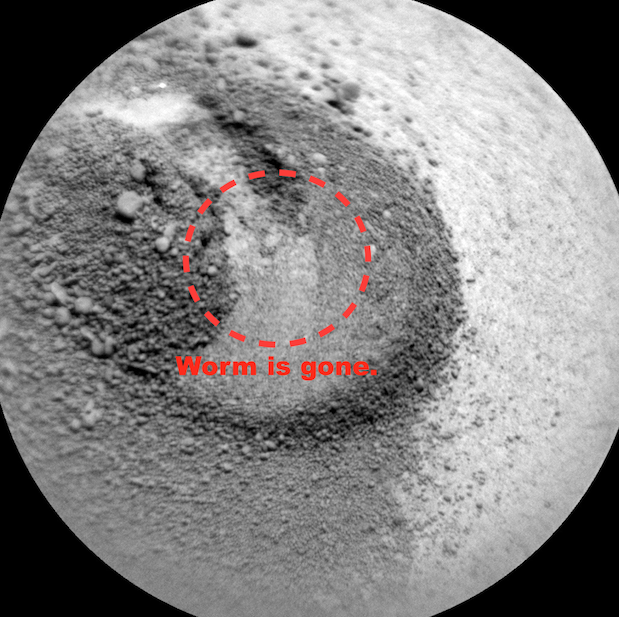 Today in the newest batch of Mars Curiosity rover photos I found a worm in the microscopic camera. This same camera took two photos just 18 minutes apart. The first camera shows no worm, but a place the worm is buried. The second photo 18 minutes later of the same location shows the worm had crawled out.