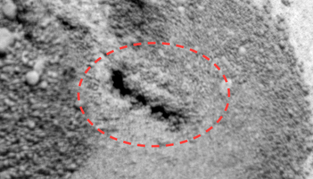 Here is a great redo of one of the most amazing faces ever found. A giant skull on a mountain. Also in this photo are a lot of signs of broken cornerstones, walls, and other parts of structures strewn about. Clearly this location was once a thriving community. Great work by Paranormal Crucible at retouching it to make it more clear, and to see what it might have looked like when it was new. But what is this material they used to make their buildings, heads and such? It looks like its a simple mix of the blueish sand found on Mars, mixed with some kind of cement mixture to give it lasting strength. Much how we make cement for buildings and sidewalks. Scott C. Waring www.ufosightingsdaily.com