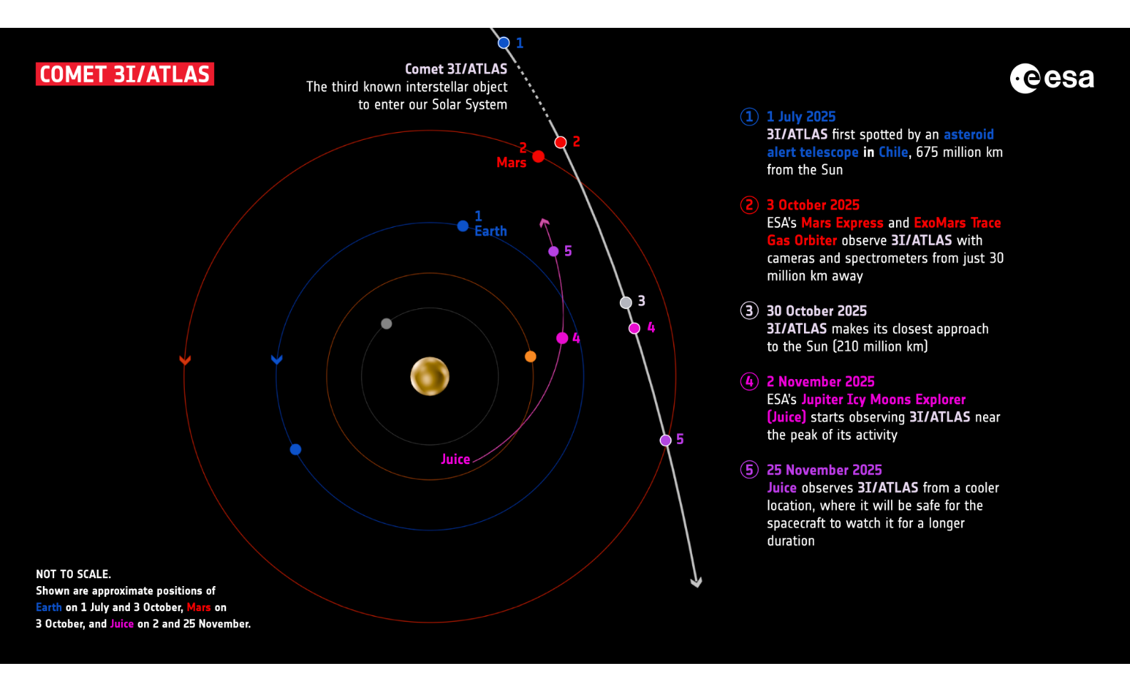 On October 29, 3I/ATLAS will reach the perihelion of its orbit, approaching the Sun at a distance of 203 million km. At this point, the comet will reach its peak activity. By studying the composition of the gases evaporating from its nucleus, scientists will be able to learn about the structure of other star systems. At this point, the comet will still be inaccessible to ground-based telescopes, but fortunately, one spacecraft will be in a suitable position to make observations. It is about the European JUICE mission. It will monitor the comet between November 2 and 25.