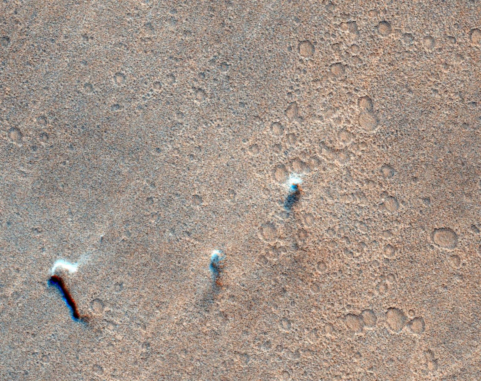 A camera aboard ESA’s ExoMars Trace Gas Orbiter captured three dust devils moving across the surface of Mars. Image: ESA/TGO/CaSSIS